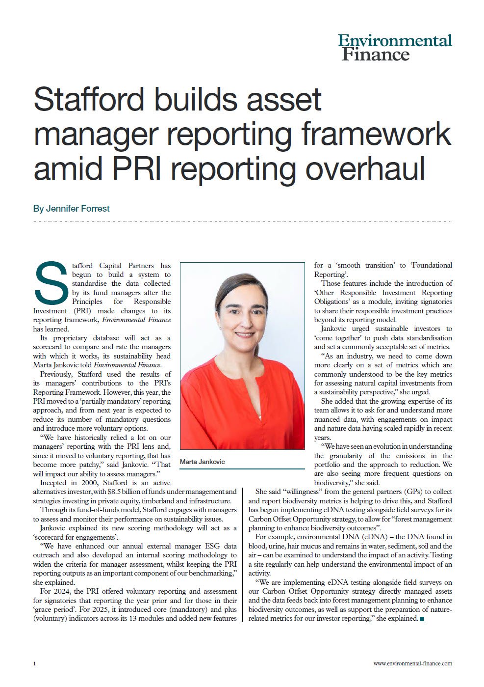 At a time when the PRI reporting framework is extending voluntary reporting and shifting to a new format, this initiative enhances Stafford’s ability to continue to evaluate and engage with managers, while supporting greater data standardisation across the industry.